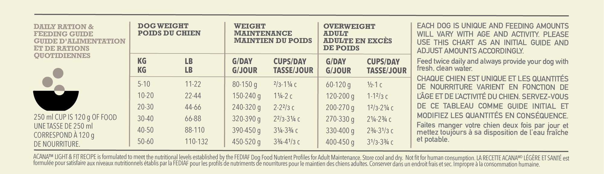 Your dog is unique and feeding requirements will vary with environment, age, and activity. That’s why we suggest starting with the guides below, and then monitoring their weight and adjusting portions as needed. Feed twice daily and remember to always keep fresh, clean water available. Use a standard 250ml/120g measuring cup. Serve dry or lightly moistened. See your veterinarian regularly. To help maintain freshness, we recommend sealing the bag tightly and storing it in a cool, dry location.