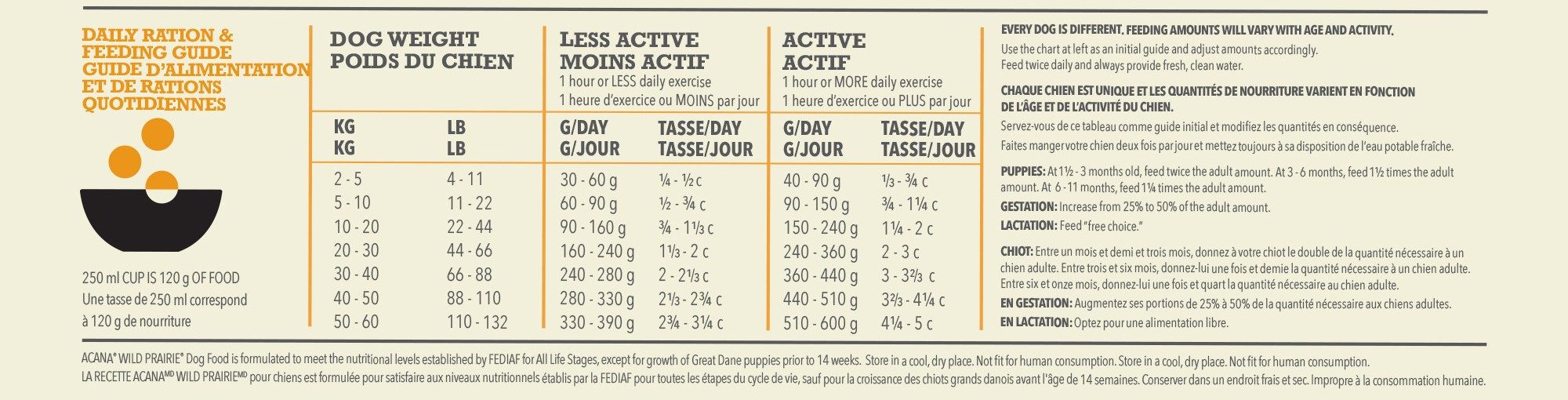 Compared to conventional foods, ACANA delivers more calories from protein and fat and fewer calories from carbohydrates, reducing the risk of obesity and promoting your dog’s peak health. CALORIE CONTENT (calculated): Metabolizable Energy is 3850 kcal/kg (462 kcal per 250ml/120g cup). Calories distributed to support peak conditioning with 36% from protein, 24% from carbohydrates, and 40% from fat.