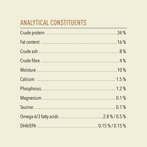 ADDITIVES (per kg): Technological additives: 1b306(i) Tocopherol extracts from vegetable oils: 121 mg, 1a330 citric acid: 40 mg. Sensory additives: Rosemary extract: 80 mg. Nutritional additives: 3a890 Choline chloride (choline): 2100 mg, 3a370 Taurine: 400 mg, 3b612 (Zinc: 160 mg), 3b407 (Copper: 11 mg),3a821 Vitamin B1: 25 mg, 3a825i Vitamin B2: 10 mg, 3a314 Niacin: 50 mg, 3a841 Calcium-D-pantothenate: 8 mg, 3a831 Vitamin B6: 7.5 mg, 3a316 Folic Acid: 0.75 mg, 3a880 Biotin: 0.25 mg, 3a835 Vitamin B12: 0.1 mg, 3a672a Vitamin A: 3750 IU, 3a671 Vitamin D3: 500 IU, 3a700 Vitamin E: 255 IU, 3c301DL-methionine: 99 mg, 3a910 L-carnitine: 50 mg. Zootechnical additives: 4b1707 Enterococcus faecium DSM 10663/NCIMB 10415: 1 x 109 CFU.