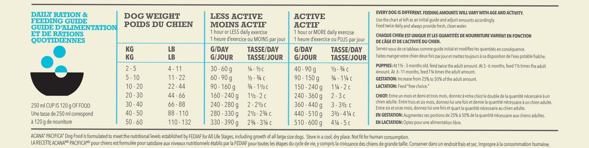 Your dog is unique and feeding requirements will vary with environment, age, and activity. That’s why we suggest starting with the guides below, and then monitoring their weight and adjusting portions as needed. Feed twice daily and remember to always keep fresh, clean water available. Use a standard 250ml/120g measuring cup. Serve dry or lightly moistened. See your veterinarian regularly. To help maintain freshness, we recommend sealing the bag tightly and storing it in a cool, dry location. ACANA Pacifica is formulated to meet the nutritional levels established by the AAFCO Dog Food Nutrient Profiles for all life stages.