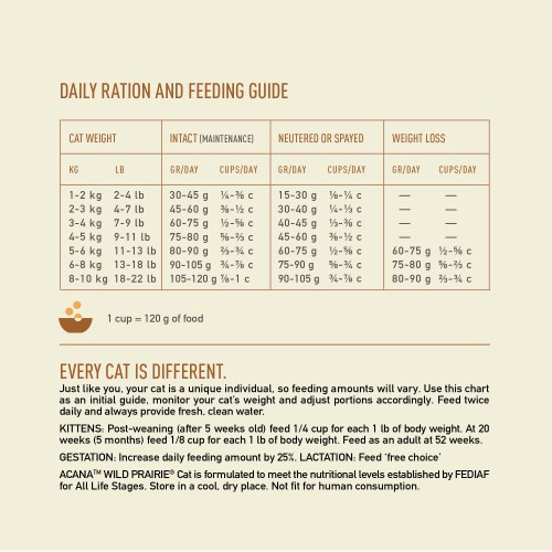 Your cat is a unique individual and their feeding requirements will vary with their environment, age and activity. That's why we suggest using this chart as a starting point, and monitoring their weight and adjusting rations as needed. We recommend feeding twice daily and always keeping fresh, clean water available.