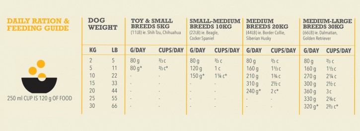 Your puppy is unique and feeding requirements will vary with environment, age, and activity. That’s why we suggest starting with the guides below, and then monitoring their weight and adjusting portions as needed. Feed twice daily and remember to always keep fresh, clean water available. Use a standard 250ml/120g measuring cup. Serve dry or lightly moistened. See your veterinarian regularly. To help maintain freshness, we recommend sealing the bag tightly and storing it in a cool, dry location.
